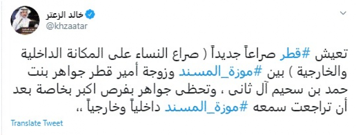 وقال في تغريدة عبر "تويتر" رصدها "المشهد العربي": "تعيش قطر صراعاً جديداً (صراع النساء على المكانة الداخلية والخارجية) بين موزة المسند وزوجة أمير قطر جواهر بنت حمد بن سحيم آل ثانى ، وتحظى جواهر بفرص أكبر بخاصة بعد أن تراجعت سمعه موزة المسند داخلياً وخارجياً ".
