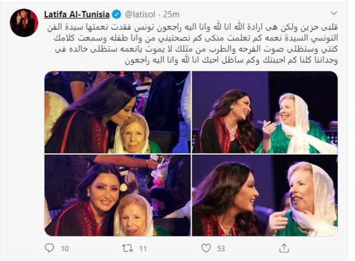 نعت الفنانة التونسية لطيفة، ابنة موطنها المطربة نعمة، الملقبة بفنانة تونس الأولى، والتي رحلت عن عالمنا الأحد 18 أكتوبر عن عمر يناهز 86 عاما.