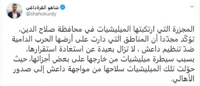 وقال في تغريدة عبر "تويتر" رصدها "المشهد العربي": "المجزرة التي ارتكبتها الميليشيات في محافظة صلاح الدين، تؤكّد مجدّدا أن المناطق التي دارت على أرضها الحرب الدامية ضدّ تنظيم داعش، لا تزال بعيدة عن استعادة استقرارها، بسبب سيطرة ميليشيات من خارجها على بعض أجزائها، حيث حوّلت تلك الميليشيات سلاحها من مواجهة داعش إلى صدور الأهالي".