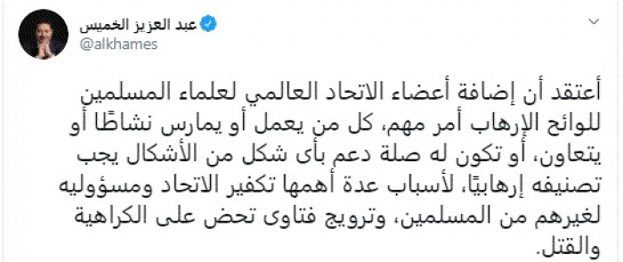 طالب الإعلامي السعودي عبدالعزيز الخميس، اليوم، بوضع أعضاء الاتحاد العالمي لعلماء المسلمين على لائحة الإرهاب.