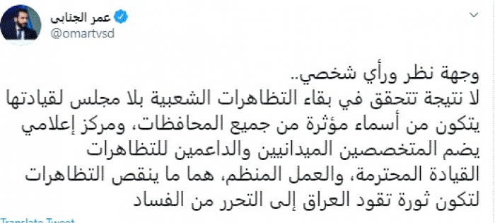 وقال في تغريدة عبر "تويتر" رصدها "المشهد العربي": "وجهة نظر ورأي شخصي.. لا نتيجة تتحقق في بقاء التظاهرات الشعبية بلا مجلس لقيادتها يتكون من أسماء مؤثرة من جميع المحافظات، ومركز إعلامي يضم المتخصصين الميدانيين والداعمين للتظاهرات القيادة المحترمة، والعمل المنظم، هما ما ينقص التظاهرات لتكون ثورة تقود العراق إلى التحرر من الفساد".