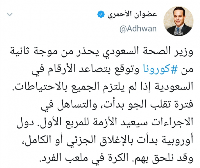 وكتب الأحمري تغريدة له عبر حسابه بتويتر ورصدها "المشهد العربي" قائلاً: "وزير الصحة السعودي يحذر من موجة ثانية من #كورونا وتوقع بتصاعد الأرقام في السعودية إذا لم يلتزم الجميع بالاحتياطات. فترة تقلب الجو بدأت، والتساهل في الإجراءات سيعيد الأزمة للمربع الأول".