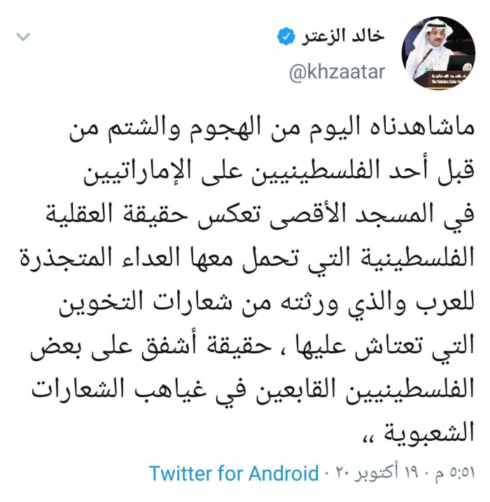 وكتب الزعترفي تغريدة له عبر "تويتر" رصدها "المشهد العربي": "ماشاهدناه اليوم من الهجوم والشتم من قبل أحد الفلسطينيين على الإماراتيين في المسجد الأقصى تعكس حقيقة العقلية الفلسطينية التي تحمل معها العداء المتجذرة للعرب والذي ورثته من شعارات التخوين التي تعتاش عليها".
