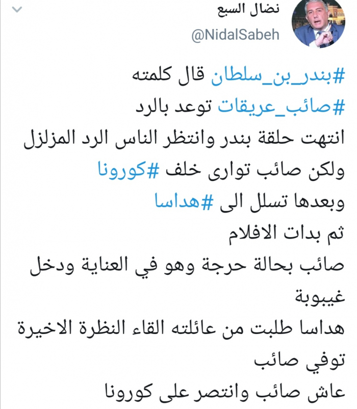 وقال السبع في تغريدة له عبر حسابه بتويتر ورصدها "المشهد العربي" بندر بن سلطان قال كلمته، صائب عريقات توعد بالرد، انتهت حلقة بندر وانتظر الناس الرد المزلزل ولكن صائب توارى خلف كورونا".