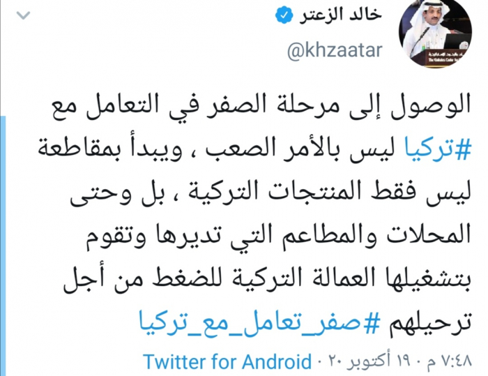 وأوضح الزعتر في تغريدة له عبر "تويتر" رصدها "المشهد العربي" أن ذلك يبدأ بمقاطعة ليس فقط المنتجات التركية ، بل وحتى المحلات والمطاعم التي تديرها وتقوم بتشغيلها العمالة التركية للضغط من أجل ترحيلهم.
