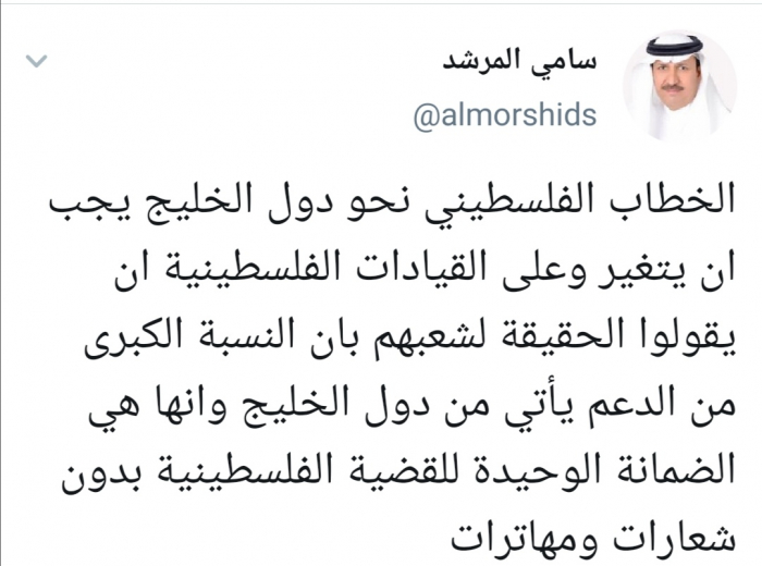 وقال المرشد في تغريدة له عبر حسابه بتويتر ورصدها "المشهد العربي": "‏‏‏‏‏‏‏‏‏‏‏‏‏‏الخطاب الفلسطيني نحو دول الخليج يجب أن يتغير وعلى القيادات الفلسطينية أن يقولوا الحقيقة لشعبهم بأن النسبة الكبرى من الدعم يأتي من دول الخليج وأنها هي الضمانة الوحيدة للقضية الفلسطينية بدون شعارات ومهاترات".