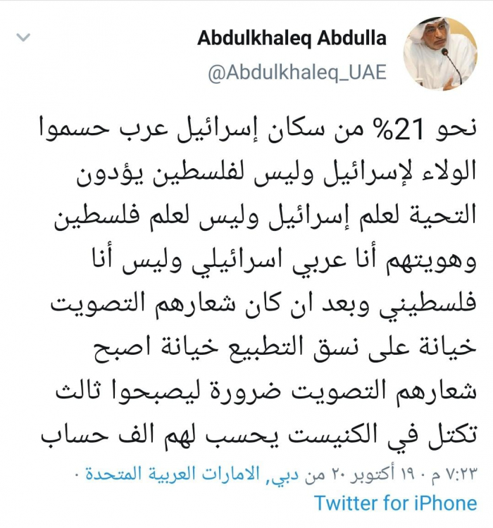 أكد الأكاديمي والسياسي الإماراتي عبد الخالق عبد الله، أن 21% من سكان إسرائيل عرب حسموا الولاء لإسرائيل وليس لفلسطين.