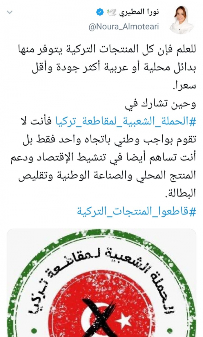 وقالت المطيري في تغريدة لها عبر حسابها بتويتر ورصدها "المشهد العربي" : "للعلم فإن كل المنتجات التركية يتوفر منها بدائل محلية أو عربية أكثر جودة وأقل سعرا".