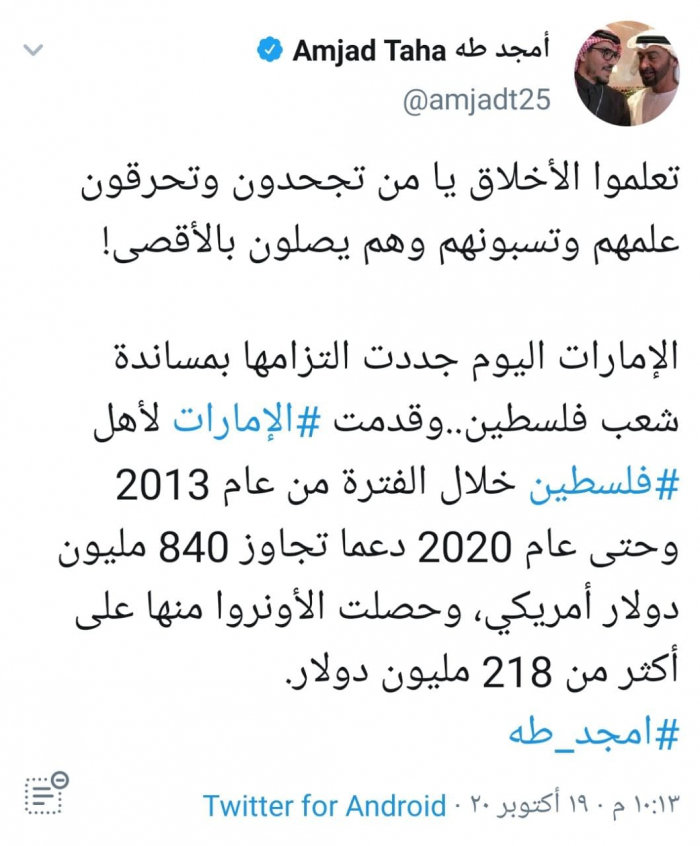 وقال طه في تغريدة له عبر "تويتر" رصدها "المشهد العربي": "تعلموا الأخلاق يا من تجحدون وتحرقون علمهم وتسبونهم وهم يصلون بالأقصى، الإمارات اليوم جددت التزامها بمساندة شعب فلسطين".