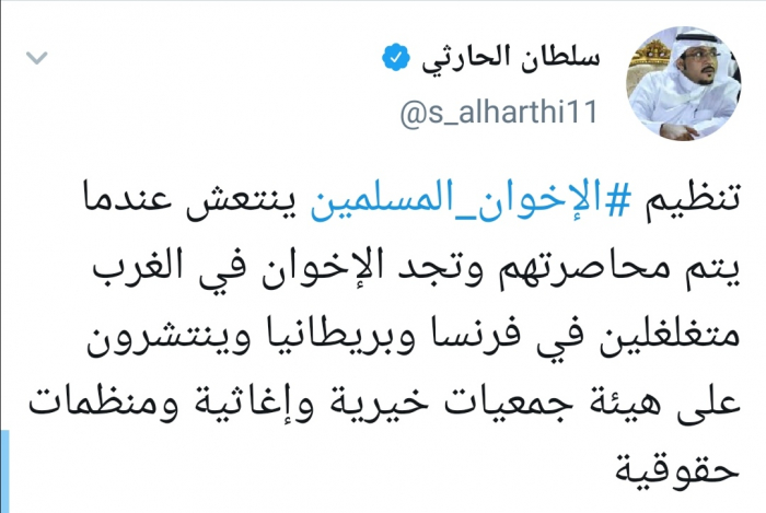وكتب الحارثي في تغريدة له عبر "تويتر" رصدها "المشهد العربي": "تنظيم الإخوان المسلمين ينتعش عندما يتم محاصرتهم وتجد الإخوان في الغرب متغلغلين في فرنسا وبريطانيا وينتشرون على هيئة جمعيات خيرية وإغاثية ومنظمات حقوقية".