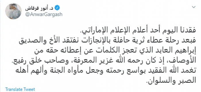 وقال في تغريدة عبر "تويتر" رصدها "المشهد العربي": " فقدنا اليوم أحد أعلام الإعلام الإماراتي. فبعد رحلة عطاء ثرية حافلة بالإنجازات نفتقد الأخ والصديق إبراهيم العابد الذي تعجز الكلمات عن إعطائه حقه من الأوصاف، إذ كان رحمه الله غزير المعرفة، وصاحب خلق رفيع. تغمد الله الفقيد بواسع رحمته وجعل مأواه الجنة وألهم أهله الصبر والسلوان".