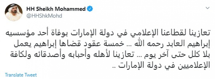 وقال في تغريدة رصدها "المشهد العربي": "تعازينا لقطاعنا الإعلامي في دولة الإمارات بوفاة أحد مؤسسيه إبراهيم العابد رحمه الله... خمسة عقود قضاها إبراهيم يعمل بلا كلل حتى آخر يوم ... تعازينا لأهله وأحبابه وأصدقائه ولكافة الإعلاميين في دولة الإمارات".