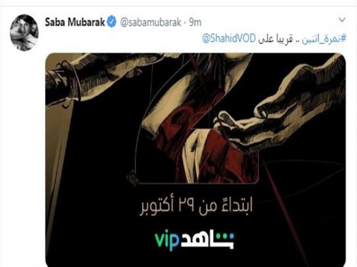 ونشرت "صبا" بوستر لها من المسلسل، عبر حسابها على تويتر، وعلقت: "نمرة إتنين ..قريبًا على شاهد vib".
