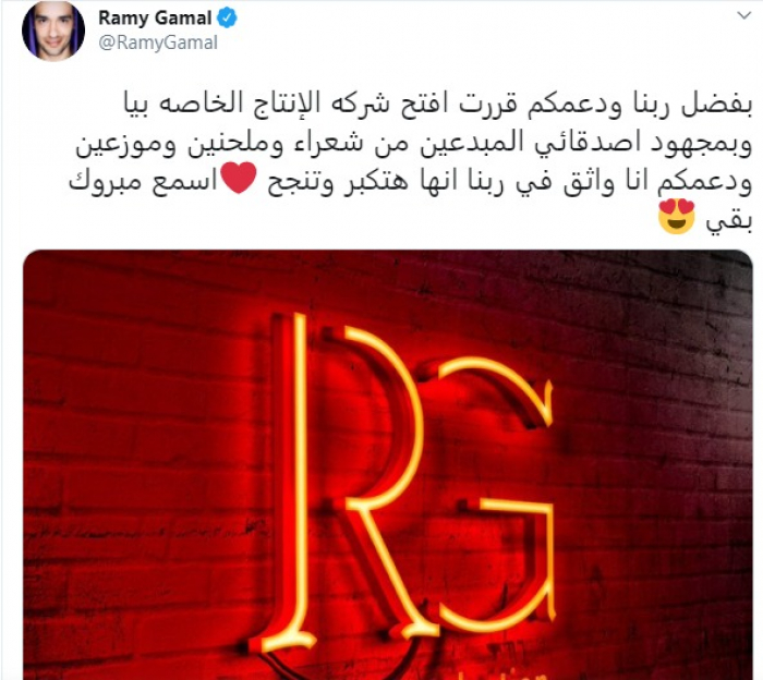 أعلن المطرب رامي جمال، عن عزمه افتتاح شركة إنتاج خاصة به، وذلك بعد ساعات قليلة من إعلانه انتهاء تعاونه مع شركة الإنتاج "نجوم ريكوردز"، التي انتجت له 4 ألبومات غنائية.
