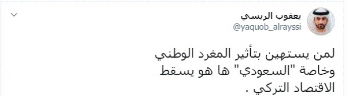 وقال في تغريدة عبر "تويتر" رصدها "المشهد العربي": "لمن يستهين بتأثير المغرد الوطني وخاصة السعودي ها هو يسقط الاقتصاد التركي".