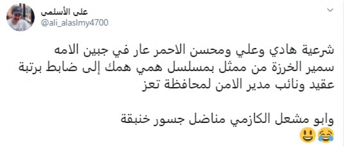 وقال في تغريدة عبر "تويتر" رصدها "المشهد العربي": "شرعية هادي وعلي ومحسن الأحمر عار في جبين الأمة، سمير الخرزة من ممثل بمسلسل همي همك إلى ضابط برتبة عقيد ونائب مدير الأمن لمحافظة تعز، وأبو مشعل الكازمي مناضل جسور خنبقة".
