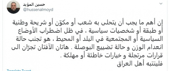 وقال في تغريدة عبر "تويتر" رصدها "المشهد العربي": "إن أهم ما يجب أن يتحلى به شعب أو مكوّن أو شريحة وطنية أو طبقة أو شخصيات سياسية، في ظل اضطراب الأوضاع السياسية أو المجتمعية في البلد أو المحيط، هو تجنب حالة انعدام الوزن وحالة تضييع البوصلة. هاتان الآفتان تجرّان إلى قرارات مرتجلة وخيارات خاطئة أو مهلكة. فلينتبه أهل العراق".