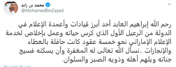 وقال في تغريدة عبر "تويتر" رصدها "المشهد العربي": "رحم الله إبراهيم العابد أحد أبرز قيادات وأعمدة الإعلام في الدولة من الرعيل الأول الذي كرس حياته وعمل بإخلاص لخدمة الإعلام الإماراتي نحو خمسة عقود كانت حافلة بالعطاء والإنجازات.. نسأل الله تعالى له المغفرة وأن يسكنه فسيح جناته ويلهم أهله وذويه الصبر والسلوان".