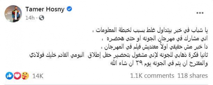 وكتب عبر صفحته الرسمية على موقع "فيسبوك": "يا شباب في خبر بيتداول غلط بسبب لخبطة المعلومات، اني مشارك في مهرجان الجونة أو حتى هحضره، دا خبر مش حقيقي أولاً معنديش فيلم في المهرجان".