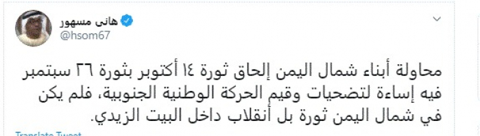 وقال في تغريدة عبر "تويتر" رصدها "المشهد العربي": "محاولة أبناء شمال اليمن إلحاق ثورة 14 أكتوبر بثورة 26 سبتمبر فيه إساءة لتضحيات وقيم الحركة الوطنية الجنوبية، فلم يكن في شمال اليمن ثورة بل انقلاب داخل البيت الزيدي".