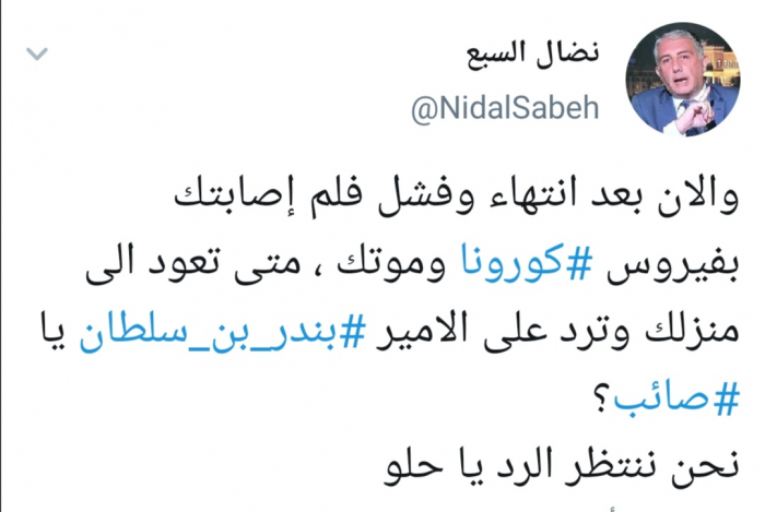 وعلق السبع في تغريدة له عبر حسابه بتويتر ورصدها "المشهد العربي" والآن بعد انتهاء وفشل فيلم إصابتك بفيروس كورونا وموتك ، متى تعود الى منزلك وترد على الأمير بندر بن سلطان يا صائب؟ نحن ننتظر الرد يا حلو".