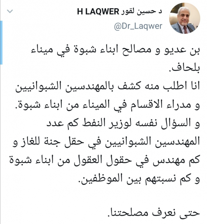 ووجه لقور: "السؤال نفسه لوزير النفط كم عدد المهندسين الشبوانيين في حقل جنة للغاز وكم مهندس في حقول العقول من أبناء شبوة وكم نسبتهم بين الموظفين حتى نعرف مصلحتنا".