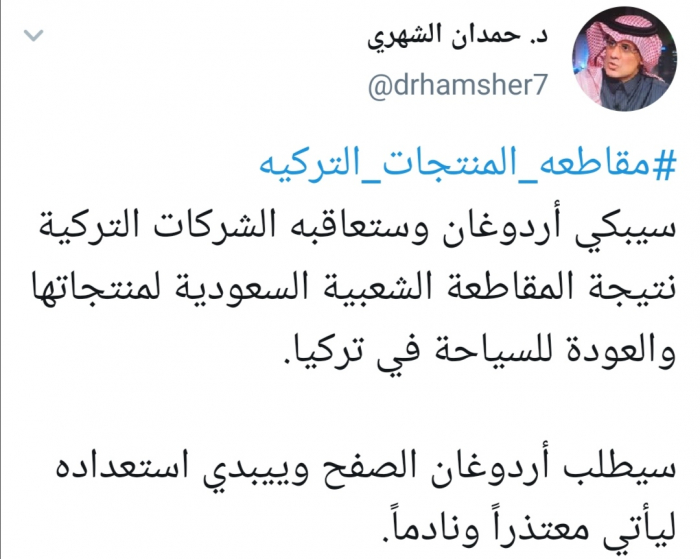 قال الأكاديمي السعودي والباحث في العلاقات الدولية الدكتور حمدان الشهري، إن الرئيس التركي رجب طيب أردوغان سيأتي نادما ومعتذرا بعد حملة مقاطعة المنتجات التركية.