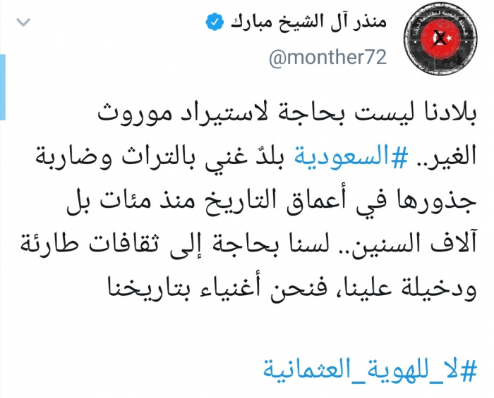 وأضاف المبارك:" لسنا بحاجة إلى ثقافات طارئة ودخيلة علينا، فنحن أغنياء بتاريخنا". مختتما بهاشتاج #لا_للهوية_العثمانية".