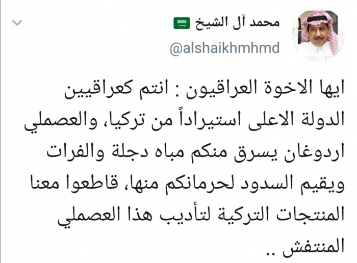 طالب الكاتب السعودي محمد آل الشيخ، العراقيين بمقاطعة المنتجات التركية لتأديب رجب طيب أردوغان.
