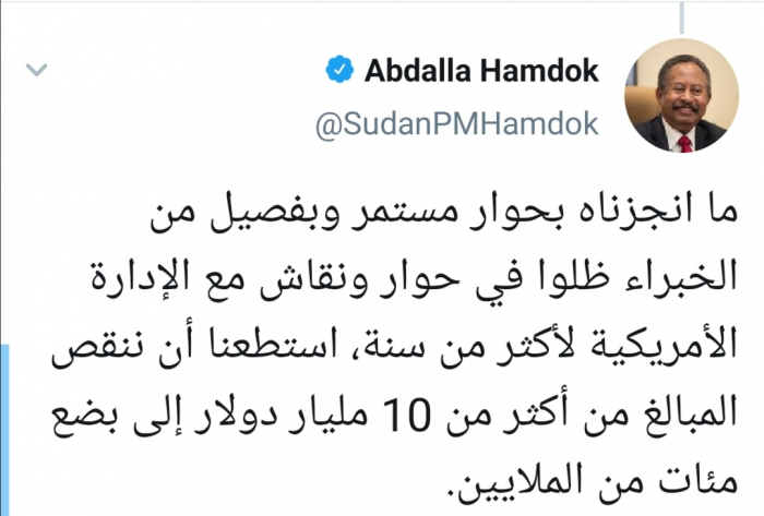 وأكد حمدوك "استطعنا أن ننقص المبالغ من أكثر من 10 مليار دولار إلى بضع مئات من الملايين".