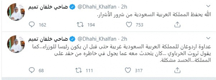 كشف نائب مدير الشرطة والأمن العام في دبي الفريق ضاحي خلفان، اليوم، سر عدواة الرئيس التركي رجب طيب أردوغان للمملكة العربية السعودية.