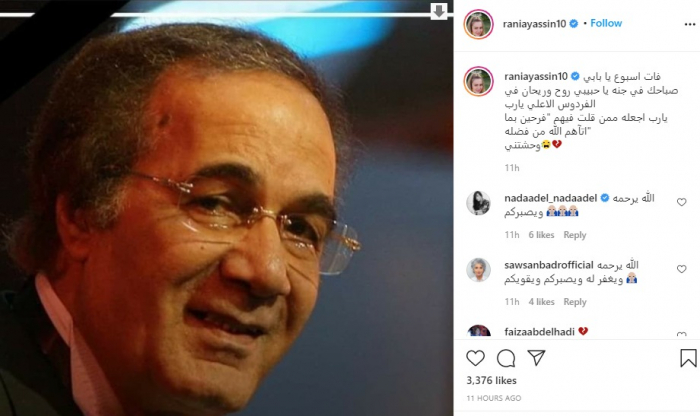وعلقت "رانيا"، على الصورة قائلة: "فات اسبوع يا بابي صباحك في جنة يا حبيب روحي وريحان في الفردوس الأعلى يا رب، يا رب اجعله ممن قلت فيهم فرحين بما اتآهم الله من فضله.. وحشتني".