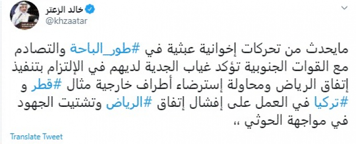 وكتب في تغريدة عبر "تويتر" رصدها "المشهد العربي": "ما يحدث من تحركات إخوانية عبثية في طورالباحة والتصادم مع القوات الجنوبية تؤكد غياب الجدية لديهم في الالتزام بتنفيذ اتفاق الرياض ومحاولة استرضاء أطراف خارجية مثال قطر وتركيا في العمل على إفشال اتفاق الرياض وتشتيت الجهود في مواجهة الحوثي".