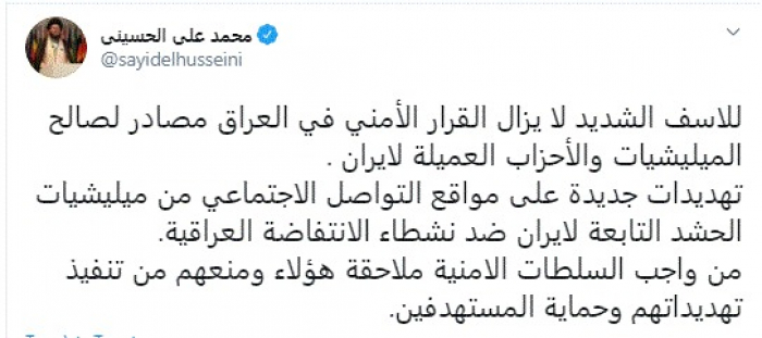 وكتب في تغريدة عبر "تويتر" رصدها "المشهد العربي": "للأسف الشديد لا يزال القرار الأمني في العراق مصادر لصالح المليشيات والأحزاب العميلة لإيران. تهديدات جديدة على مواقع التواصل الاجتماعي من مليشيات الحشد التابعة لايران ضد نشطاء الانتفاضة العراقية".