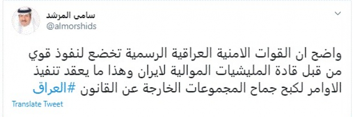 وكتب في تغريدة عبر "تويتر" رصدها "المشهد العربي": "واضح أن القوات الامنية العراقية الرسمية تخضع لنفوذ قوي من قبل قادة المليشيات الموالية لإيران وهذا ما يعقد تنفيذ الأوامر لكبح جماح المجموعات الخارجة عن القانون".
