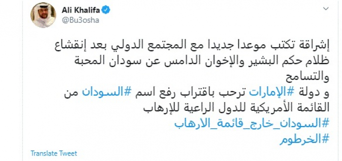 وأضاف: "ودولة الإمارات ترحب باقتراب رفع اسم السودان من القائمة الأمريكية للدول الراعية للإرهاب.. السودان خارج قائمة الإرهاب".