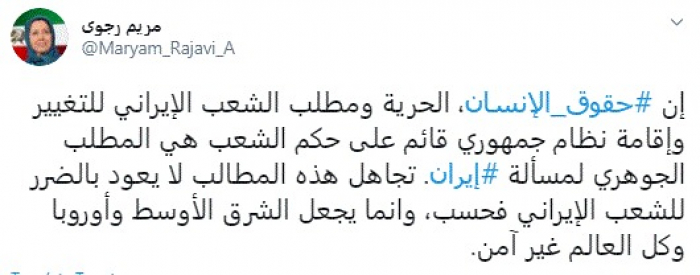 وكتبت في تغريدة عبر "تويتر" رصدها "المشهد العربي": "إن حقوق الإنسان، الحرية ومطلب الشعب الإيراني للتغيير وإقامة نظام جمهوري قائم على حكم الشعب هي المطلب الجوهري لمسألة إيران".