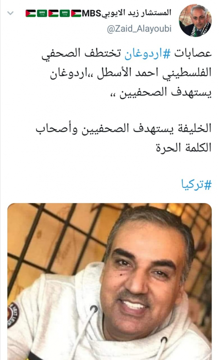 وكتب الأيوبي عبر تغريدة له على "تويتر" رصدها " المشهد العربي":"عصابات أردوغان تختطف الصحفي الفلسطيني أحمد الأسطول".
