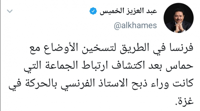 وقال الخميس في تغريدة عبر حسابه بتويتر ورصدها "المشهد العربي" : "فرنسا في الطريق لتسخين الأوضاع مع حماس بعد اكتشاف ارتباط الجماعة التي كانت وراء ذبح الاستاذ الفرنسي بالحركة في غزة".