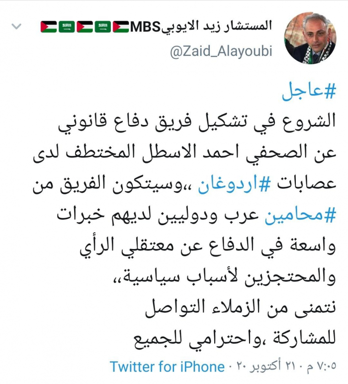 وكتب الأيوبي عبر تغريدة له على "تويتر" رصدها " المشهد العربي":"الشروع في تشكيل فريق دفاع قانوني عن الصحفي احمد الأسطل المختطف لدى عصابات أردوغان".