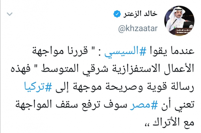 وقال الزعتر في تغريدة له عبر "تويتر" رصدها "المشهد العربي":"عندما يقوا السيسى: "قررنا مواجهة الأعمال الاستفزازية شرقي المتوسط " فهذه رسالة قوية وصريحة موجهة إلى تركيا تعني أن مصر سوف ترفع سقف المواجهة مع الأتراك".