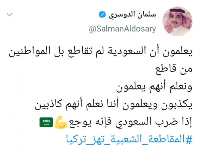 وقال الدوسري عبر تغريدة له على "تويتر" رصدها " المشهد العربي": يعلمون أن السعودية لم تقاطع بل المواطنين من قاطع