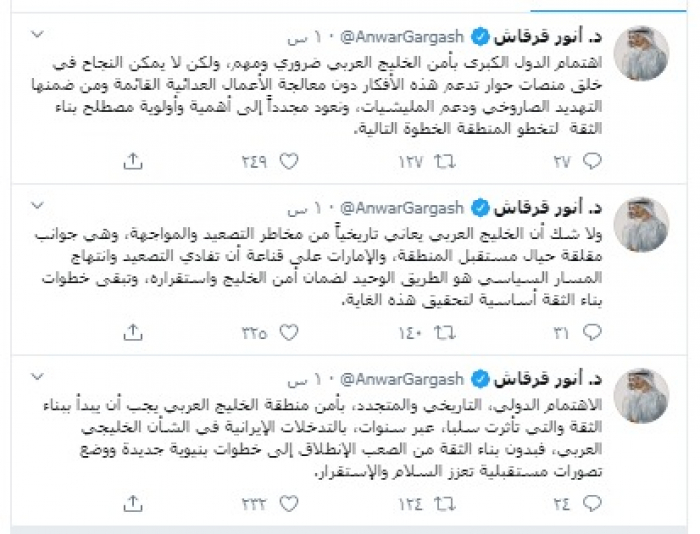 وأضاف في تغريدة أخرى: "لا شك أن الخليج العربي يعاني تاريخياً من مخاطر التصعيد والمواجهة، وهي جوانب مقلقة حيال مستقبل المنطقة، والإمارات على قناعة أن تفادي التصعيد وانتهاج المسار السياسي هو الطريق الوحيد لضمان أمن الخليج واستقراره، وتبقى خطوات بناء الثقة أساسية لتحقيق هذه الغاية".