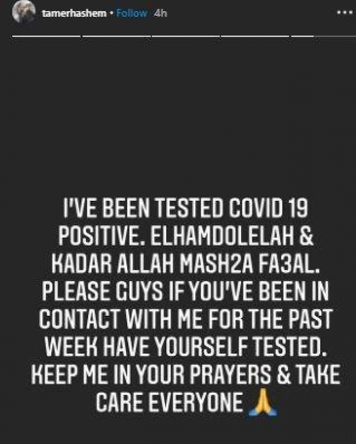 وكتب هاشم، عبر ستوري حسابه على إنستجرام: "نتيجة مسحة كوفيد 19 إيجابية.. الحمد لله.. قدر الله وما شاء فعل..أي شخص تواصل معي خلال الأسبوع الماضي يقوم بعمل إختبار كورونا.. أدعولي، وعلى الجميع الحذر"