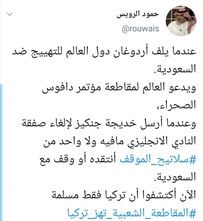 وعندما أرسل خديجة جنكيز لإلغاء صفقة النادي الانجليزي مافيه ولا واحد من سلاتيح الموقف أنتقده أو وقف مع السعودية".