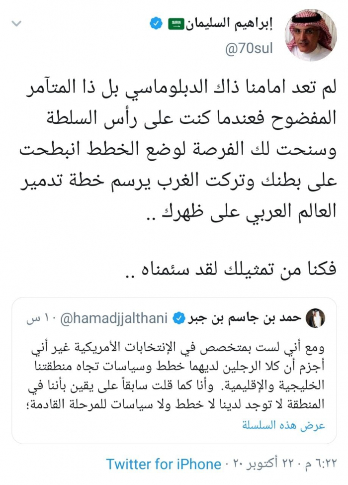 وكتب السليمان عبر تغريدة له على "تويتر" رصدها " المشهد العربي":"لم تعد أمامنا ذاك الدبلوماسي بل ذاك المتآمر المفضوح فعندما كنت على رأس السلطة وسنحت لك الفرصة لوضع الخطط انبطحت على بطنك وتركت الغرب يرسم خطة تدمير العالم العربي على ظهرك".