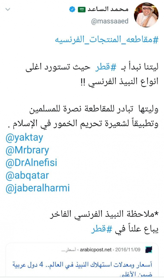 وشارك الساعد في تغريدة له عبر "تويتر" رصدها "المشهد العربي" هاشتاج #مقاطعة_المنتجات_الفرنسية وعلق قائلا "ليتنا نبدأ بـقطر حيث تستورد أغلى أنواع النبيذ الفرنسي".