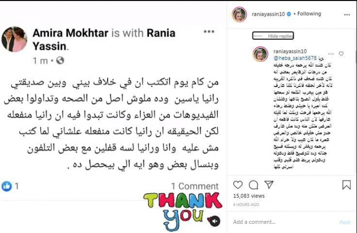 ردت الفنانة رانيا محمود ياسين، على تعليق من إحدى متابعيها عبر "إنستجرام"، طالبتها فيه بتوضيح حقيقة خلافها مع أميرة مختار ابنة الفنانة رجاء الجداوي على خلفية ذكر الأخيرة إصابة الفنان محمود ياسين بالزهايمر.