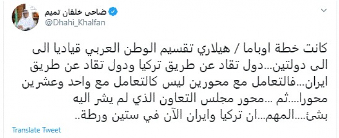 وقال في تغريدة عبر "تويتر" رصدها "المشهد العربي": "كانت خطة أوباما/ هيلاري تقسيم الوطن العربي قياديا إلى دولتين... دول تقاد عن طريق تركيا ودول تقاد عن طريق إيران".