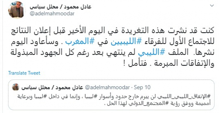 وقال في تغريدة عبر "تويتر" رصدها "المشهد العربي": "كنت قد نشرت هذه التغريدة في اليوم الأخير قبل إعلان النتائج للاجتماع الأول للفرقاء الليبيين في المغرب. وسأعاود اليوم نشرها. الملف الليبي لم ينتهي بعد رغم كل الجهود المبذولة والإتفاقات المبرمة. فتأمل".